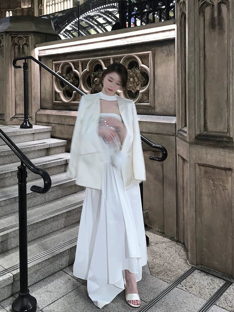A sophisticated strapless gown with ruched bodice, flowing A-line skirt, and a chic choker detail — perfect for evening soirées and grand celebrations.