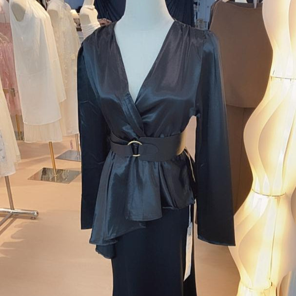 Minimal yet elegant — a soft off-shoulder knit dress with a slim belt for a refined modern silhouette.