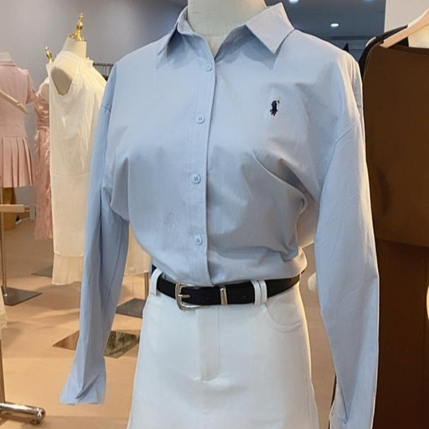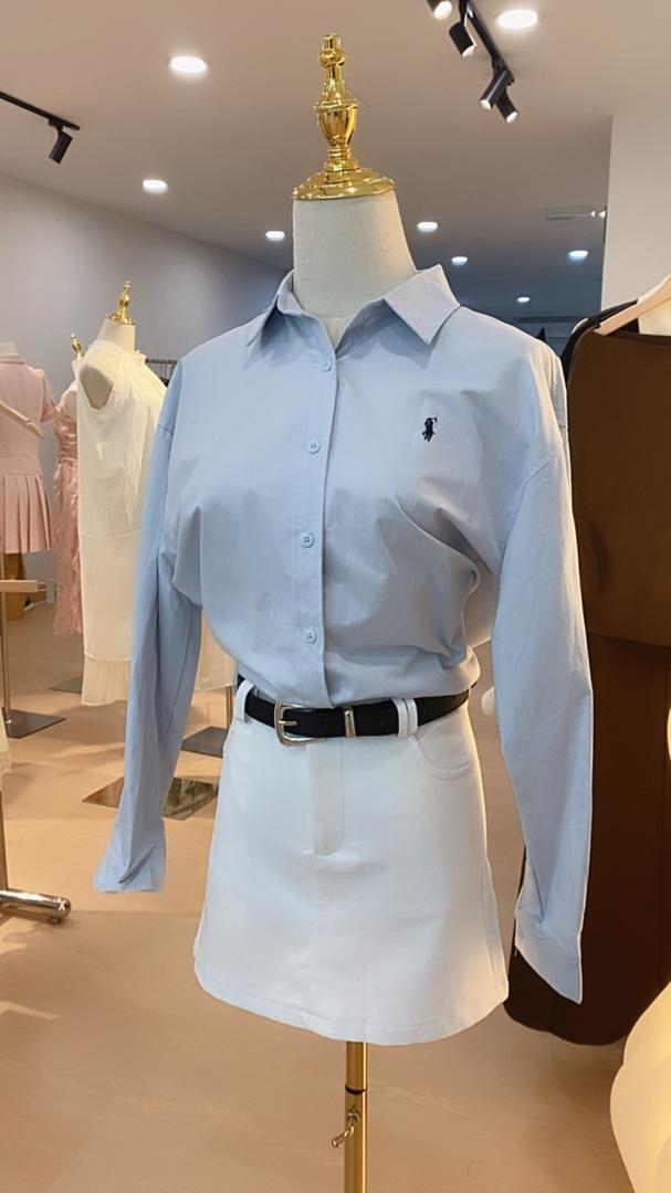 A clean and chic combo featuring a light blue shirt and white mini skirt — effortlessly smart with a hint of French elegance.