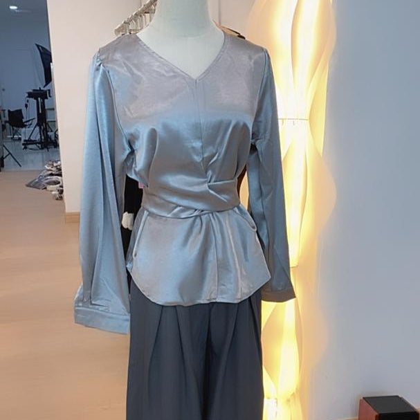 A sleek satin top paired with wide-leg pants — elegant, polished, and perfect for evening sophistication.